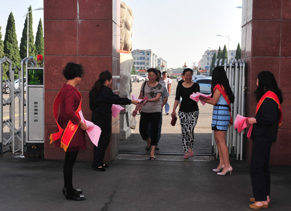 圖為:6月5日上午,4名“環(huán)保使者”正在公司門口發(fā)放“六五”世界環(huán)境日宣傳單。