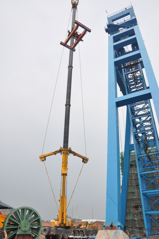 工程建設(shè)公司一次吊裝成功楊柳礦新主井總重達55噸的天輪。