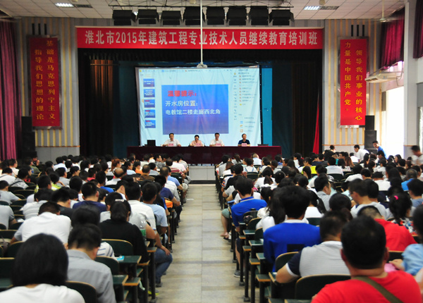 7月24日上午,由淮北市城鄉(xiāng)建設委員會主辦的2015年全市建設工程專業(yè)技術人員繼續(xù)教育培訓班培訓班在安徽礦業(yè)職業(yè)技術學院開班,來自全市在職的建設工程專業(yè)中級以下(含中級)技術人員1200余人參加了這次培訓。