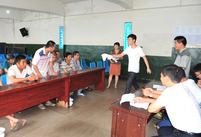 圖為:8月25日中午,公司東部井職教辦負(fù)責(zé)人正在運(yùn)輸區(qū)會(huì)議室隨機(jī)抽考出勤職工的安全知識(shí),答對(duì)者可以獲得一份小獎(jiǎng)品。