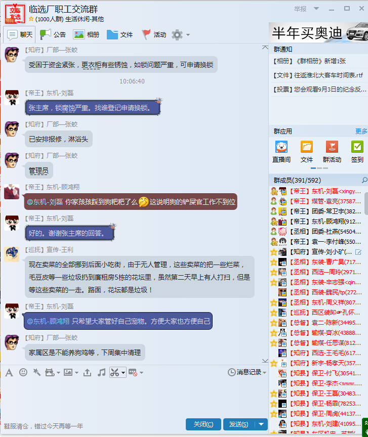 “張主席,乘車卡、飯卡、洗浴卡能否三卡合一”、“澡堂淋浴頭損壞得多、更衣柜銹蝕嚴(yán)重”、“家屬區(qū)還有養(yǎng)雞養(yǎng)狗現(xiàn)象,擾亂社區(qū)文明秩序”,8月28日,臨選廠職工QQ交流群里你一言、我一語(yǔ)。一問才知道,原來(lái)是該廠工會(huì)主席張蛟正在嘗試運(yùn)用“互聯(lián)網(wǎng)”渠道開展信訪民主接待日。