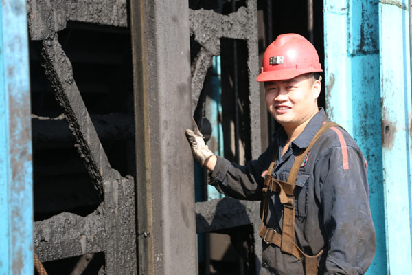 副井上口的把鉤工陳方革。國慶節(jié)當天,副井共提升84鉤。