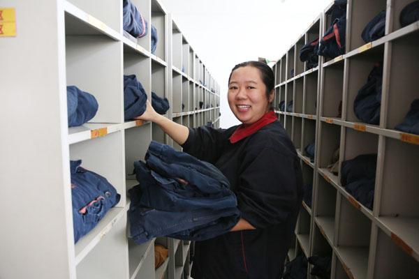 王影正在將清洗干凈的工作服放進衣柜。對于洗衣房的姐妹們來說,職工滿意就是她們的工作標準。