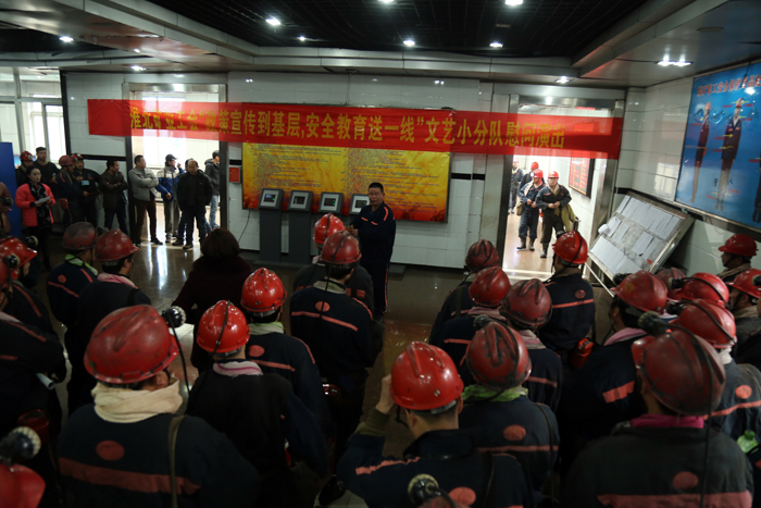 演出期間,演員們走進職工中間,和職工的互動更是讓職工師傅感到了春天般的溫暖,更感受到了煤礦生產(chǎn)安全關(guān)系你我他。職工們還積極參與到集團公司2016年形勢政策知識問答中,大家踴躍舉手,現(xiàn)場搶答,回答正確者,獲得精美禮品一份,得到的是祝福,更是一份安全的叮囑。表演、問答、叮囑句句不離安全,演出慰問給現(xiàn)場所有的職工敲響了新年的鐘聲,提醒大家煤礦生產(chǎn)安全第一。