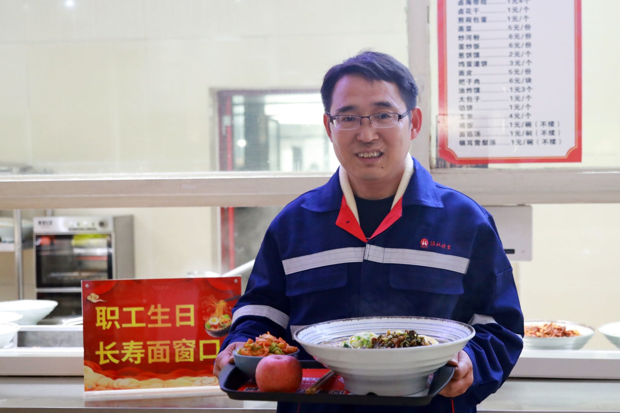 “張師傅,來(lái)吃面。”剛準(zhǔn)備上中班的綜掘一區(qū)張建輝突然被食堂工作人員喊住。乳白色骨湯里浮著碧綠菜心,溏心蛋裹著醬色肉臊,手搟面根根筋道,香氣撲鼻,配著一碗特色菜和一顆蘋果,這頓生日餐格外豐盛。