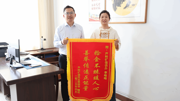 當日下午,該礦通風區(qū)女工蔡桂華在井口返回到工作崗位時,摸到脖子上的項鏈沒有了,當時心里很著急,于是她順著上下班走過的路來回找了2遍,又去礦南門停車場及車里找了幾遍。找尋未果后,蔡桂華趕緊聯(lián)系物業(yè)管理科監(jiān)控室,說明自己不慎遺失貴重項鏈,請求調(diào)取監(jiān)控視頻協(xié)助查找。物業(yè)管理科當日值班姜海龍通過詳細詢問項鏈的款式特征、鑲嵌細節(jié)以及蔡桂華當日下午在工廣區(qū)的具體活動軌跡,最終確認其失主身份,并將李峰峰拾到項鏈的經(jīng)過告訴了她。找回失物的蔡桂華隨即致電李峰峰,向其表達誠摯謝意,并制作了一條錦旗送給李峰峰,當面致謝。