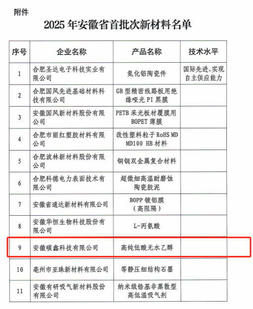 近日,安徽省工業(yè)和信息化廳正式發(fā)布2025年度“首批次新材料”名單,安徽碳鑫科技有限公司自主研發(fā)的“TX-Ⅱ型高純低酸無水乙醇”榜上有名,這是今年淮北市首個被評定為安徽省首批次新材料的產(chǎn)品。