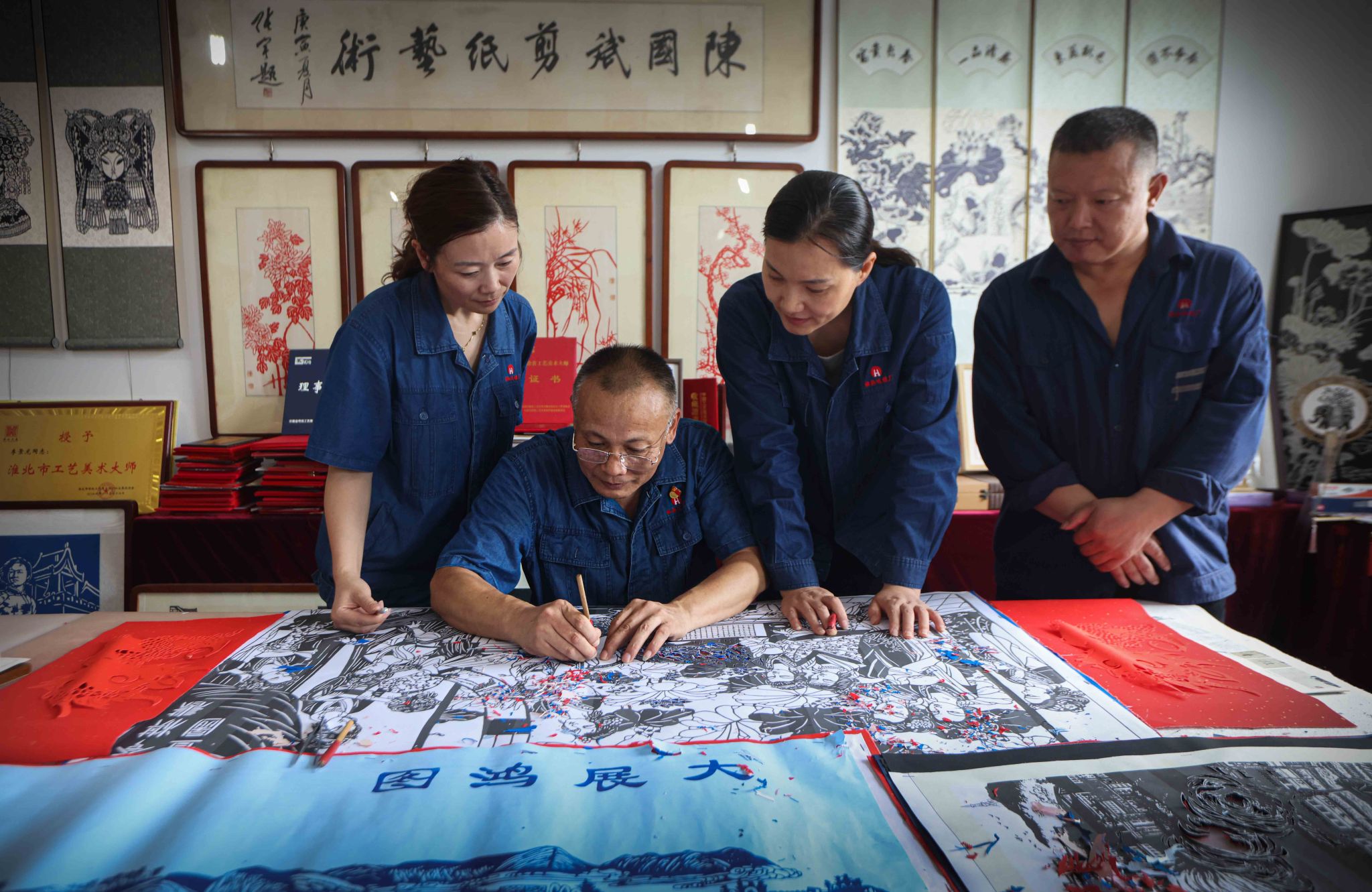 “手腕要放松,剪刀要順著線條走”。陳國斌輕聲指導(dǎo)著,額頭上滲出細(xì)密的汗珠。這位安徽省工藝美術(shù)大師、民間優(yōu)秀文化傳承人,淮北市“陳氏剪紙”非遺傳承人,已經(jīng)連續(xù)8個(gè)月利用工作日午休時(shí)間,義務(wù)為廠里職工開設(shè)剪紙培訓(xùn)班。