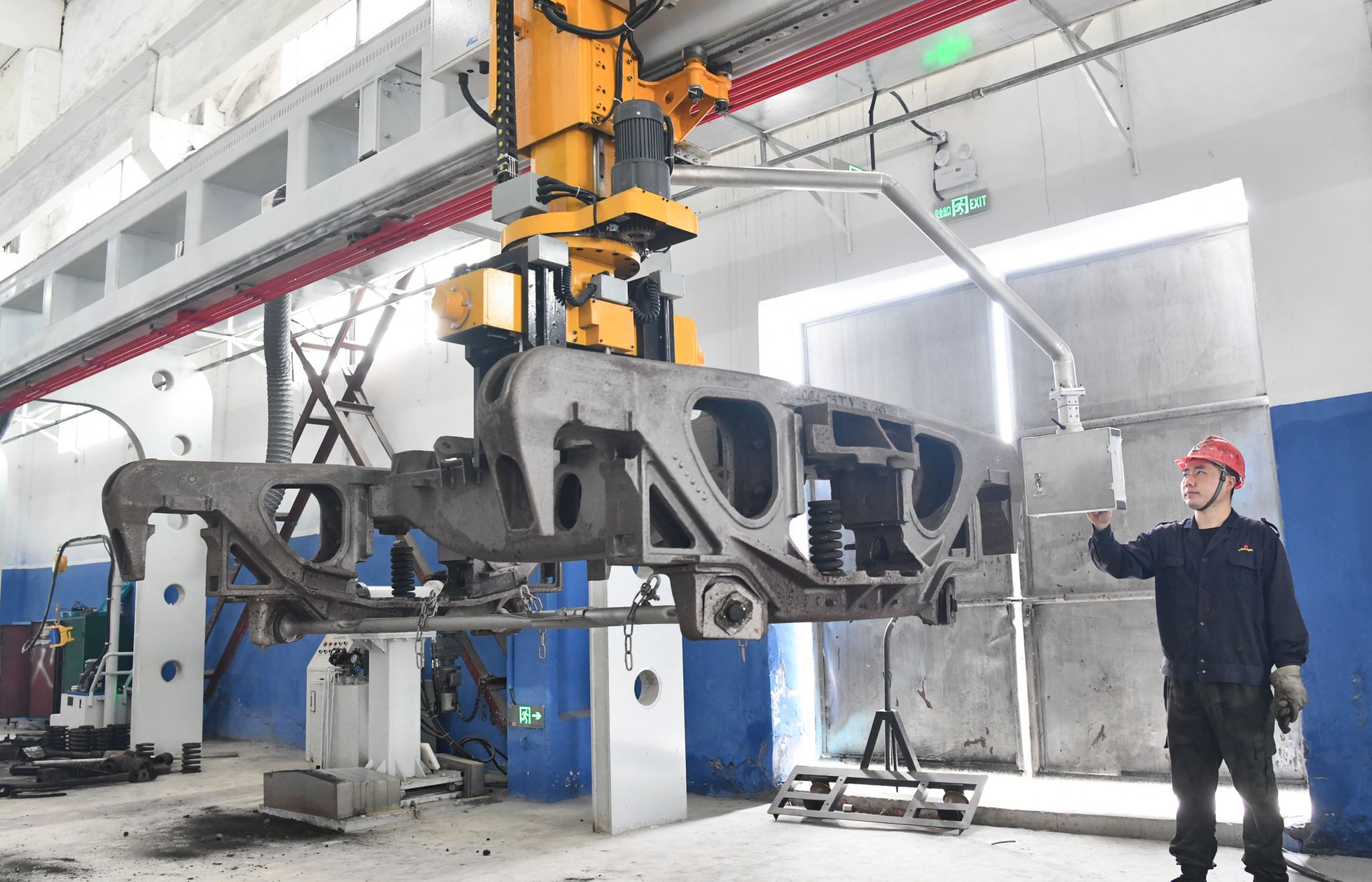 在轉(zhuǎn)向架除銹工位,布滿油污與銹跡的轉(zhuǎn)向架部件進入封閉式自動化除銹設(shè)備,經(jīng)過高壓拋丸與精密拋光,僅需3分鐘便煥然一新,光潔如初?!耙郧俺P全靠人工敲敲打打,粉塵大、效果差;現(xiàn)在設(shè)備全自動處理,所有配件徹底分解除銹,出來就跟新的一樣?!爆F(xiàn)場操作員介紹說。