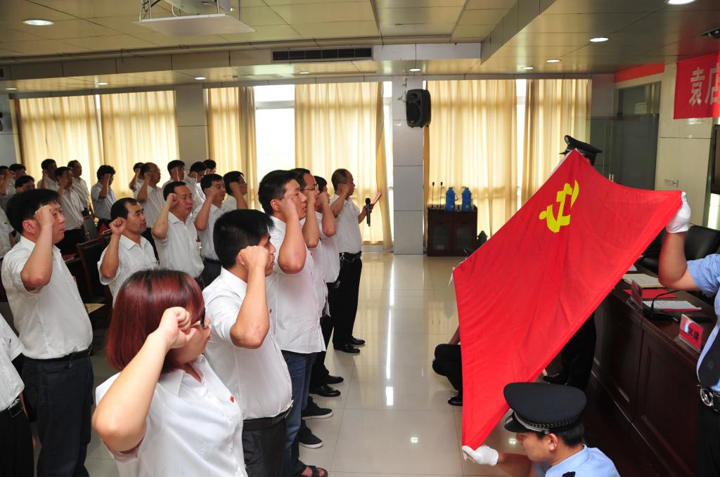 隨后,紀(jì)委書記胡學(xué)鋒領(lǐng)誓。2016年新接收的5名預(yù)備黨員鄭重舉起右拳,面對鮮艷的黨旗齊聲宣誓;與會老黨員也滿懷激情地重溫了入黨誓詞。