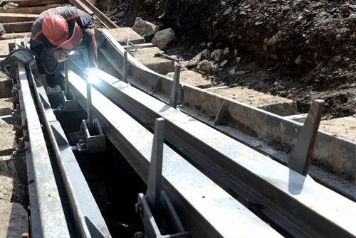 圖(2)朱仙莊礦2名職工在對改造排矸系統(tǒng)進行運輸安裝。