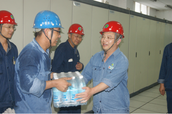 華塑股份董事長、總經(jīng)理丘永桂為高溫作業(yè)員工送上鹽汽水