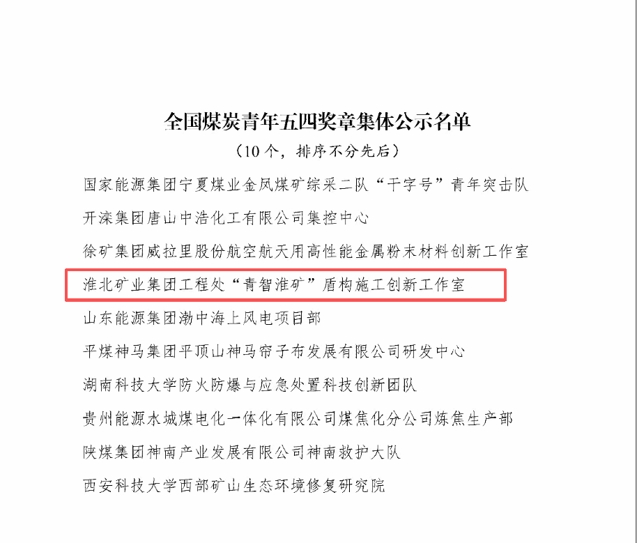 近日,全國(guó)煤炭行業(yè)共青團(tuán)工作指導(dǎo)和推進(jìn)委員會(huì)公布第13屆全國(guó)煤炭青年五四獎(jiǎng)?wù)录w名單,淮北礦業(yè)集團(tuán)工程處“青智淮礦”盾構(gòu)施工創(chuàng)新工作室入選。