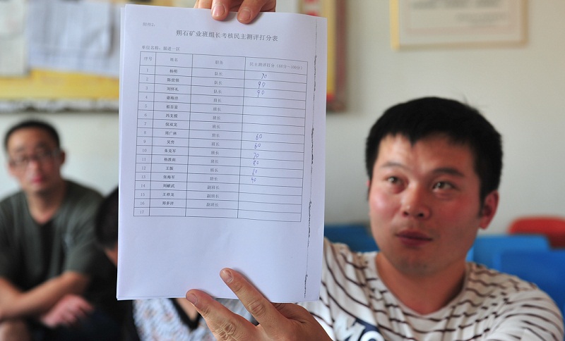 8月15日,朔石礦業(yè)東部井掘進一區(qū)職工手持剛剛填寫的《班組長考核民主測評打分表》。