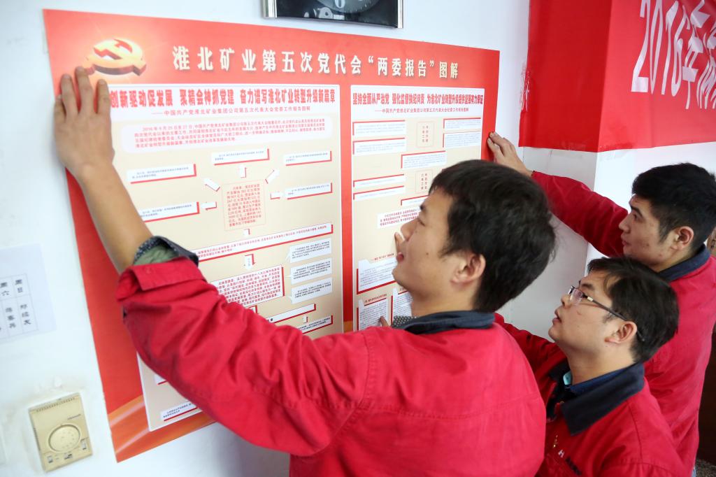 渦北礦緊緊圍繞“兩委報告”,通過牌板展、《黨代會之聲》廣播專題欄目、有獎?wù)魑?、黨代會精神宣講進科區(qū)等活動,全方位、多層次宣傳、貫徹淮北礦業(yè)第五次黨代會精神,進一步激發(fā)廣大干群干事創(chuàng)業(yè)的熱情。圖為10月25日,綜采二區(qū)職工張貼礦統(tǒng)一制作的“兩委工作報告”圖解。(責編:徐成貴)