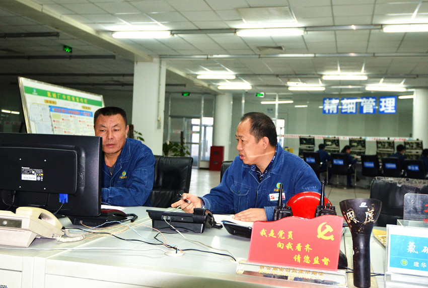 圖為11月18日,黨群工作部工作人員在氯堿廠現(xiàn)場幫助解決問題。