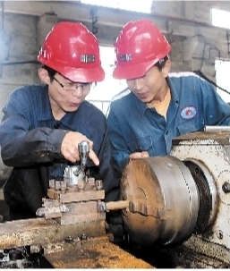 ?為讓技術(shù)得到傳承,安徽淮北礦業(yè)集團(tuán)朱仙莊礦機(jī)廠建立了青年工人與老工人、技師“1+N”培訓(xùn)模式,即一名徒弟同時跟隨多名師傅學(xué)習(xí)技術(shù)。彭飛 攝