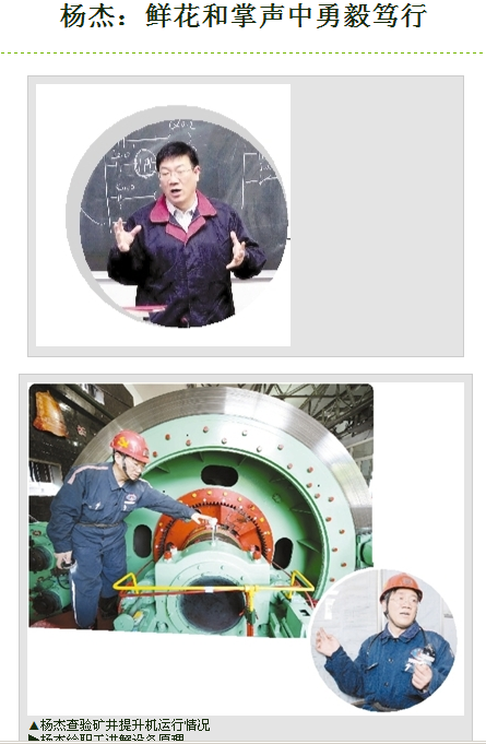 楊杰,安徽淮北礦業(yè)集團朔石礦業(yè)公司機電科高級技師。他研讀80多本專業(yè)書籍,進行大小革新200多項,由一名普通工人成長為淮北礦業(yè)首席技師、楊杰講堂主任。他先后獲得全國勞動模范、國家級技能大師、“同煤杯·第二屆感動中國的礦工”十大杰出人物等多項榮譽稱號。