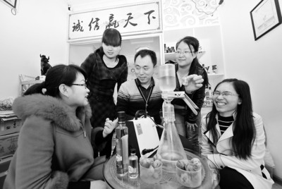 4月8日,淮北市民生路旁的一家店鋪里,王芳(中)向團隊成員講解核桃油品質(zhì)的鑒別技巧。《安徽日報》(4月19日6版)