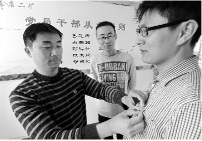 安徽淮北礦業(yè)集團依托“三會一課”等黨的組織生活制度,將“兩學(xué)一做”學(xué)習(xí)教育與安全生產(chǎn)各項工作有機結(jié)合,并開展了“亮身份、作承諾、當(dāng)先鋒、樹形象”等活動。圖為袁店二礦黨員在相互佩戴黨員徽章。 黃世鵬 攝