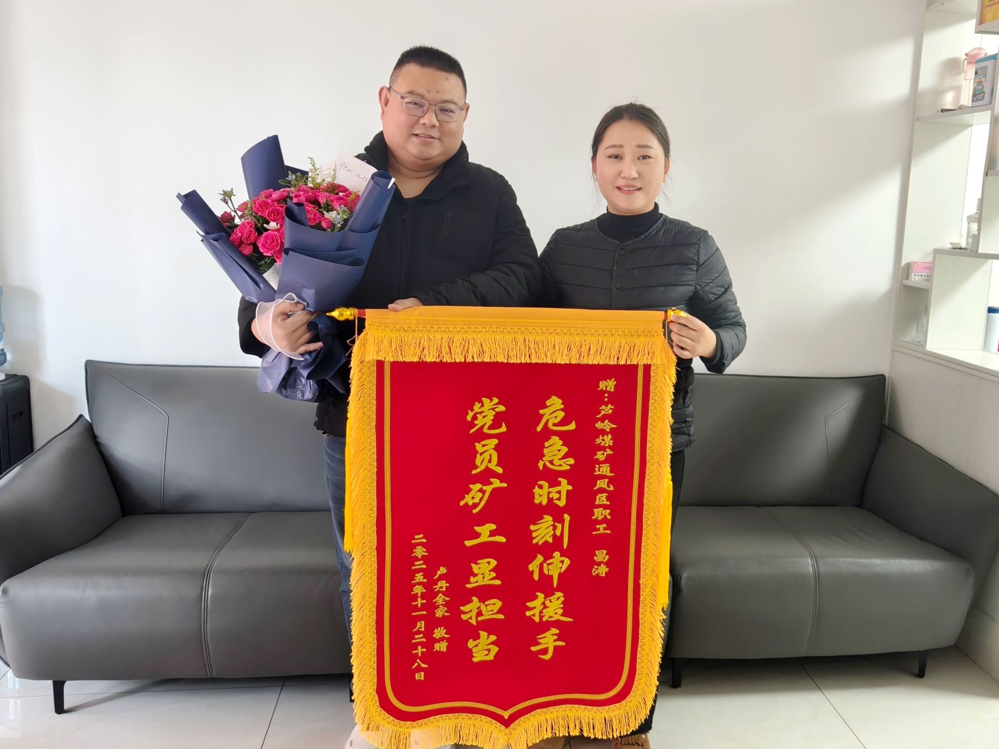 被救男孩家長(zhǎng)送來鮮花錦旗感謝昌濤(左)