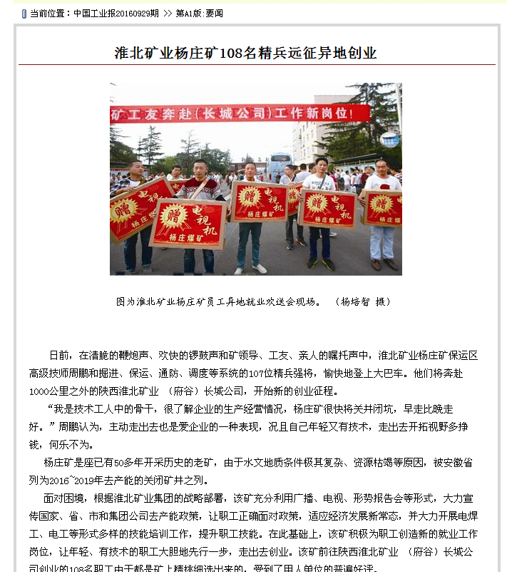 “楊莊礦很快將關(guān)井,走出去是必然的事,現(xiàn)在礦上想到的不是減人,而是想辦法為我們聯(lián)系工作,為我們搭建外出創(chuàng)業(yè)的舞臺(tái),礦主要領(lǐng)導(dǎo)還親自把我們送到就業(yè)的地方,我現(xiàn)在很高興,也很感謝礦領(lǐng)導(dǎo)?!痹摰V赴陜西淮北礦業(yè)(府谷)長(zhǎng)城公司創(chuàng)業(yè)的領(lǐng)頭人之一、原礦掘進(jìn)區(qū)隊(duì)黨支部書記趙磊開心地說(shuō)道。