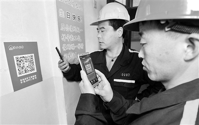安徽淮北礦業(yè)集團把職工工資、獎金分配情況通過公開欄、工資查詢系統(tǒng)等渠道向職工公開,給職工一本明白賬。圖為朱仙莊煤礦綜掘二區(qū)2名礦工正在單位會議室用手機掃二維碼查詢收入情況。 張萬學(xué) 攝