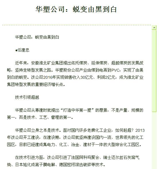 近年來,安徽淮北礦業(yè)集團(tuán)提出依托煤炭、延伸煤炭、超越煤炭的發(fā)展戰(zhàn)略,堅(jiān)持走轉(zhuǎn)型發(fā)展之路。華塑股份公司產(chǎn)業(yè)由煤到電再到PVC,實(shí)現(xiàn)了由黑到白的蛻變。該公司2016年實(shí)現(xiàn)銷售收入30億元、利潤2億元,成為淮北礦業(yè)集團(tuán)轉(zhuǎn)型發(fā)展的重要經(jīng)濟(jì)增長點(diǎn)。