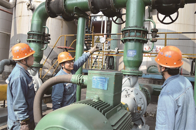 淮北礦業(yè)臨渙焦化公司化產(chǎn)車(chē)間技術(shù)工人余海濤(左二)在向工友講解設(shè)備保養(yǎng)維護(hù)知識(shí) 魏玉東/攝 作者:本報(bào)記者 張曉梅 / 吳明 張驊 |