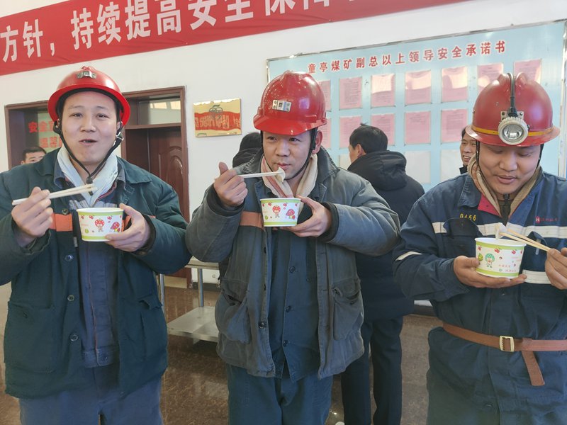 “謝謝你們,這餃子里有家的味道,我們一定時刻牢記安全?!眲偵暇木C采區(qū)職工吃著熱乎乎的餃子,交口稱贊,整個副井大廳被一片喜慶、祥和的氛圍所環(huán)繞。