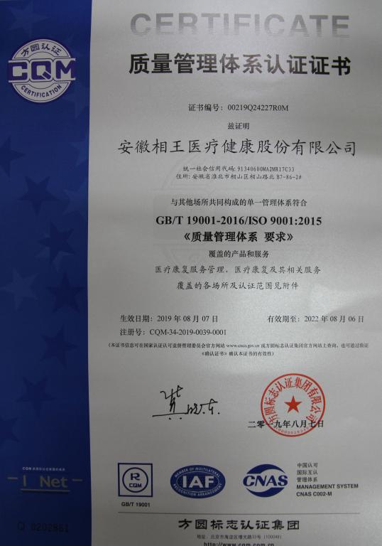 日前,相王健康獲得由CQM頒發(fā)的ISO 9001:2015質量管理體系認證證書,標志著公司在醫(yī)院管理和醫(yī)療服務品質邁上了一個新的臺階。