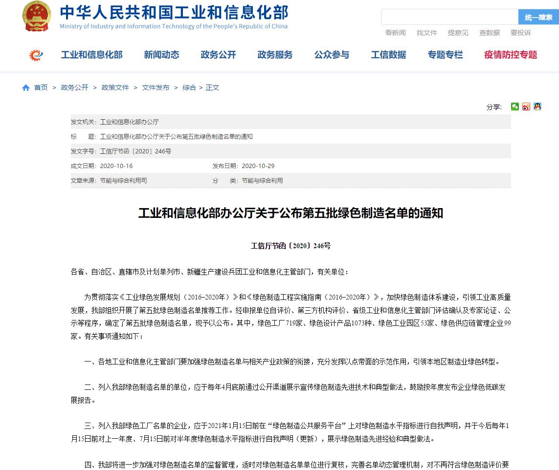 本次發(fā)布的名單中,綠色工廠719家、綠色設(shè)計產(chǎn)品1073種、綠色工業(yè)園區(qū)53家、綠色供應(yīng)鏈管理企業(yè)99家。