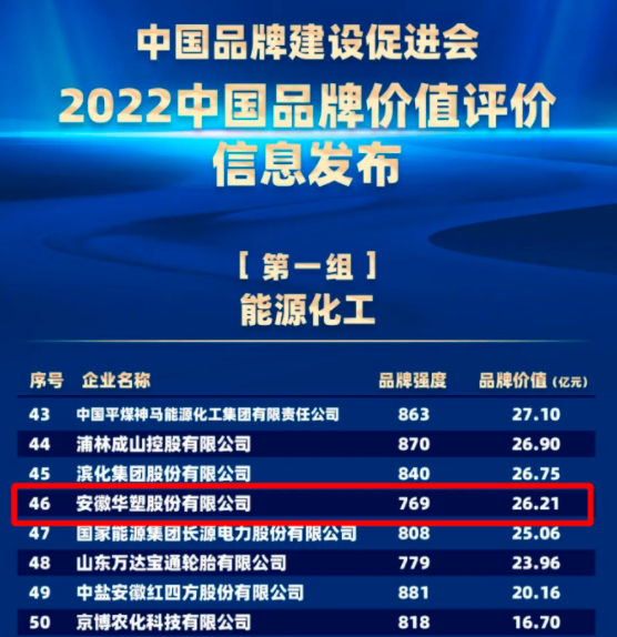 2022年9月5日,中國品牌建設(shè)促進(jìn)會、中國資產(chǎn)評估協(xié)會、新華社民族品牌工程辦公室等單位在京聯(lián)合發(fā)布“2022中國品牌價值評價信息”。今年參加評價的品牌數(shù)量達(dá)到1056個,涵蓋大部分行業(yè)的龍頭企業(yè)。在2022年品牌價值評價中,華塑股份品牌位列第一組“能源化工”第46位,品牌強(qiáng)度為769,品牌價值26.21億元,是華塑股份品牌建設(shè)工作的重要成果。