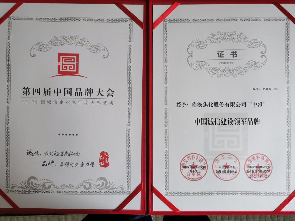 12月12日,中國管理科學(xué)研究院、中國市場協(xié)會創(chuàng)新與品牌委員會等在北京聯(lián)合舉辦中國品牌大會暨2020年中國誠信企業(yè)家年度表彰盛典。臨渙焦化公司“中淮”品牌被授予中國誠信建設(shè)領(lǐng)軍品牌和“金獒獎”,彰顯了臨渙焦化公司長久堅持的企業(yè)誠信精神和良好的市場信譽受到社會和市場的認(rèn)可和肯定。