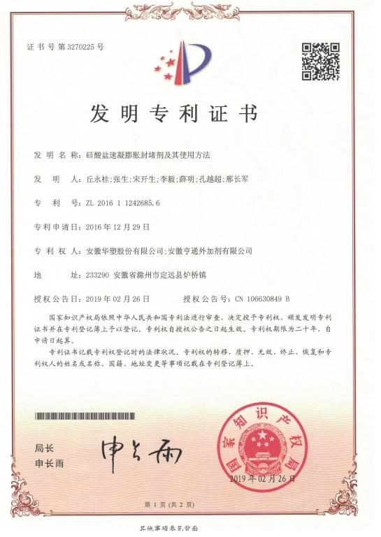 近日,由華塑股份組織研發(fā)的《硅酸鹽速凝膨脹封堵劑及其使用方法》技術(shù),榮獲國家知識(shí)產(chǎn)權(quán)局授予的“發(fā)明專利證書”。此發(fā)明專利是華塑股份聯(lián)合安徽亨通外加劑有限公司共同研究,在淮北礦業(yè)集團(tuán)及相關(guān)單位的大力配合和支持下完成的。