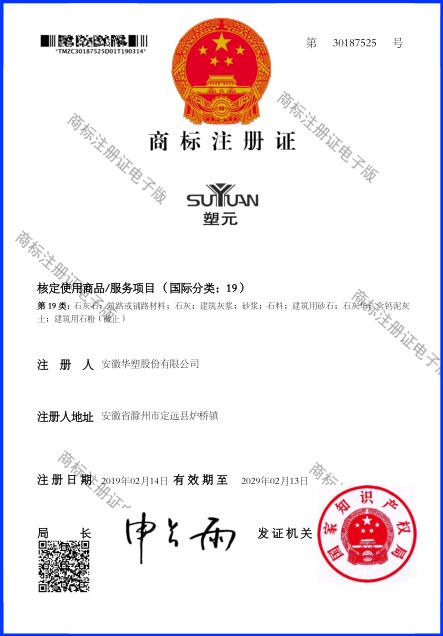2019年一季度末,華塑股份繼主營(yíng)業(yè)務(wù)PVC(聚氯乙烯)產(chǎn)品“淮滁”、“醉翁亭”商標(biāo)申請(qǐng)注冊(cè)成功后,石灰產(chǎn)品“塑元”商標(biāo)于近日收到了由國(guó)家知識(shí)產(chǎn)權(quán)局頒發(fā)的商標(biāo)注冊(cè)證書,正式注冊(cè)成功。