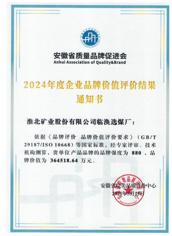 近日,在安徽省品牌促進(jìn)會(huì)官網(wǎng)發(fā)布的2024年度安徽省企業(yè)品牌價(jià)值評(píng)價(jià)信息中,臨渙選煤廠以“品牌強(qiáng)度880,品牌價(jià)值36.4億元”摘得產(chǎn)品品牌類的桂冠。