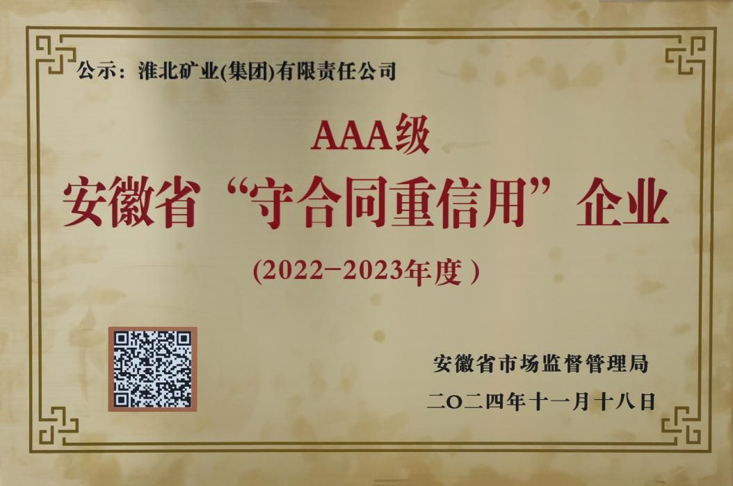 淮北礦業(yè)集團(tuán)榮獲安徽省市場監(jiān)管局頒發(fā)的3A級守合同重信用企業(yè)稱號