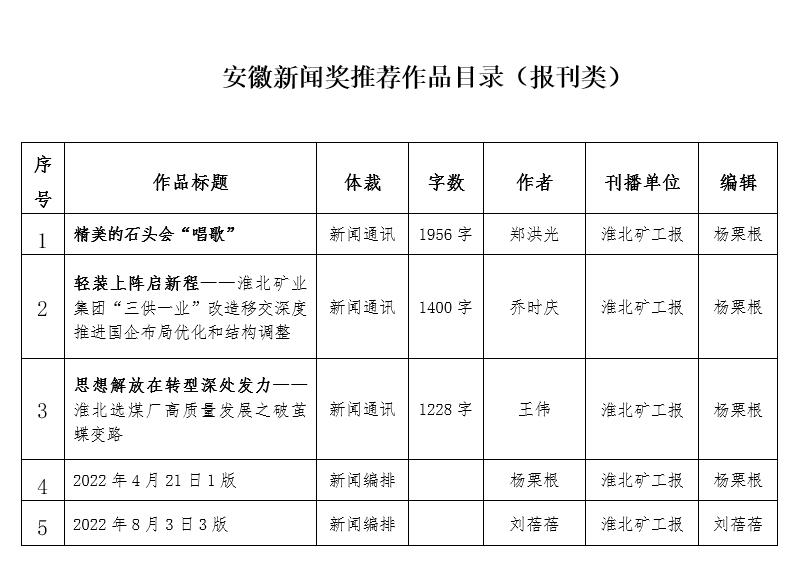 為認(rèn)真做好2022年度安徽新聞獎報送評選工作,進(jìn)一步提高報送評選工作的公開性、公平性和公正性,真正把好作品報上來、評出來,淮北礦工報社根據(jù)《安徽省新聞工作者協(xié)會關(guān)于開展2022年度安徽新聞獎評選工作的通知》精神和工作需要,成立評委會,并于2023年3月4日召開了評審會議,以無記名投票的方式評選出下列作品推薦參加2022年度安徽新聞獎評選。